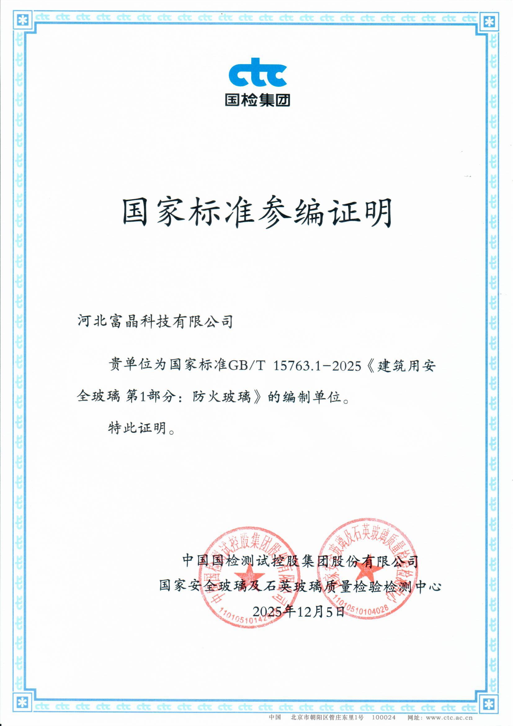 2025年12月5日,河北富晶科技有限公司获国检集团、国家安全玻璃及石英玻璃质量检验检